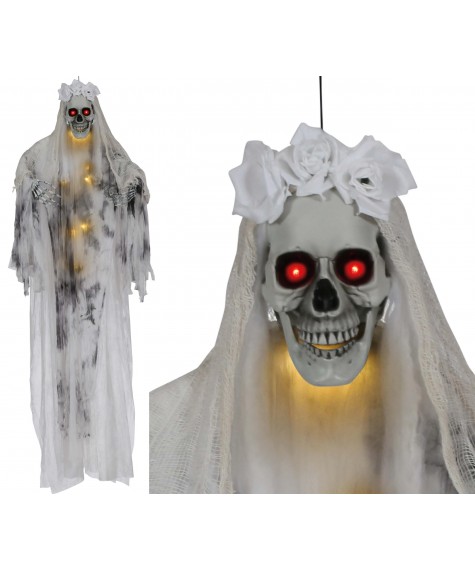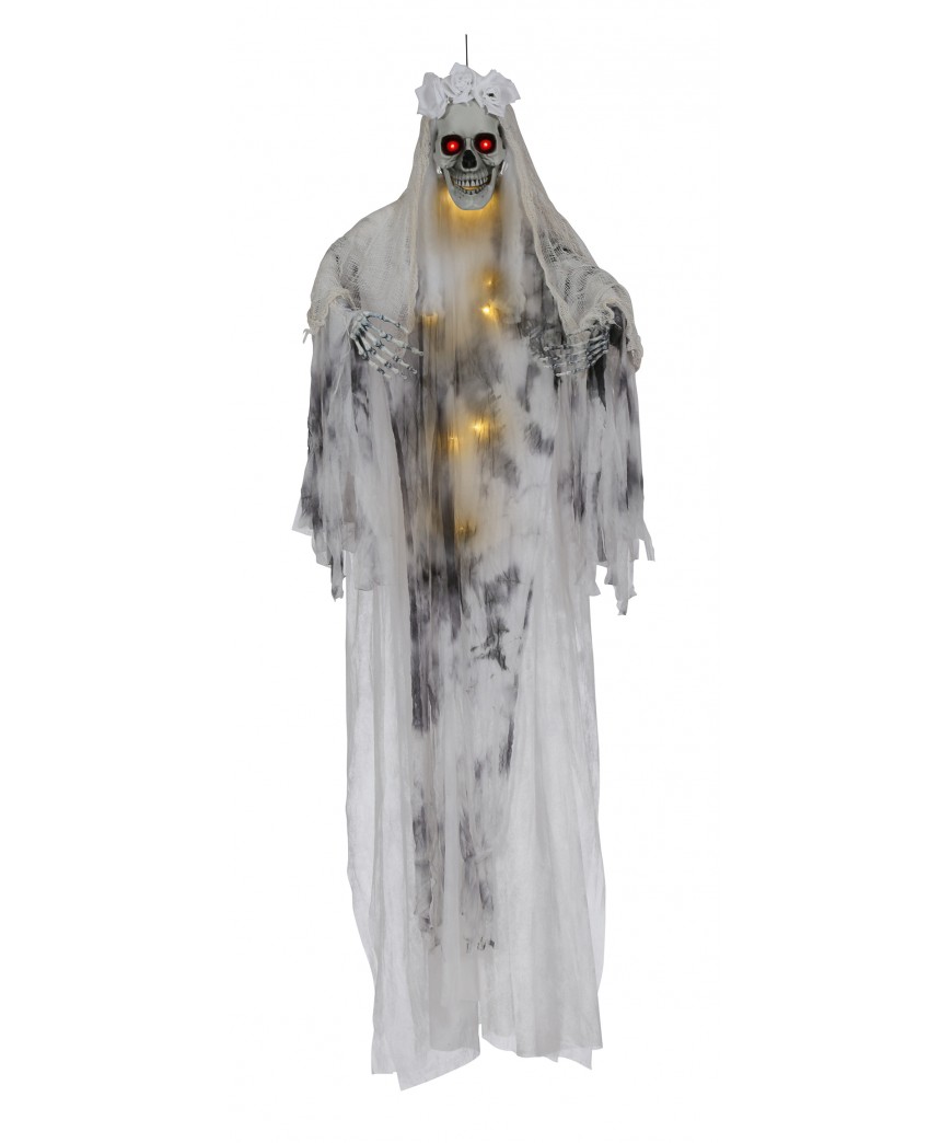 Grande suspension de fiancée fantôme de 180 cm avec éclairage LED intégré. Effet lumineux pour une ambiance saisissante. Parfait pour un décor de porte ou plafond.