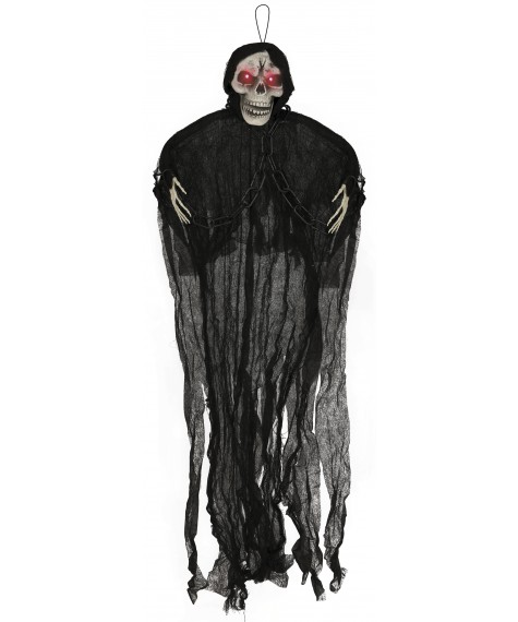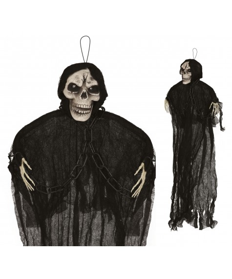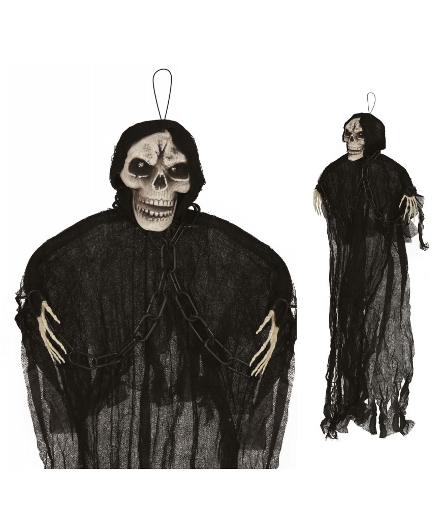 Squelette suspendu avec éclairage led et des chaînes pour une scène d'horreur réaliste. Grand format idéal pour décorer une entrée ou un jardin. Résistant et réutilisable.