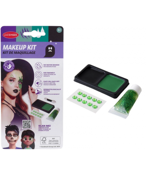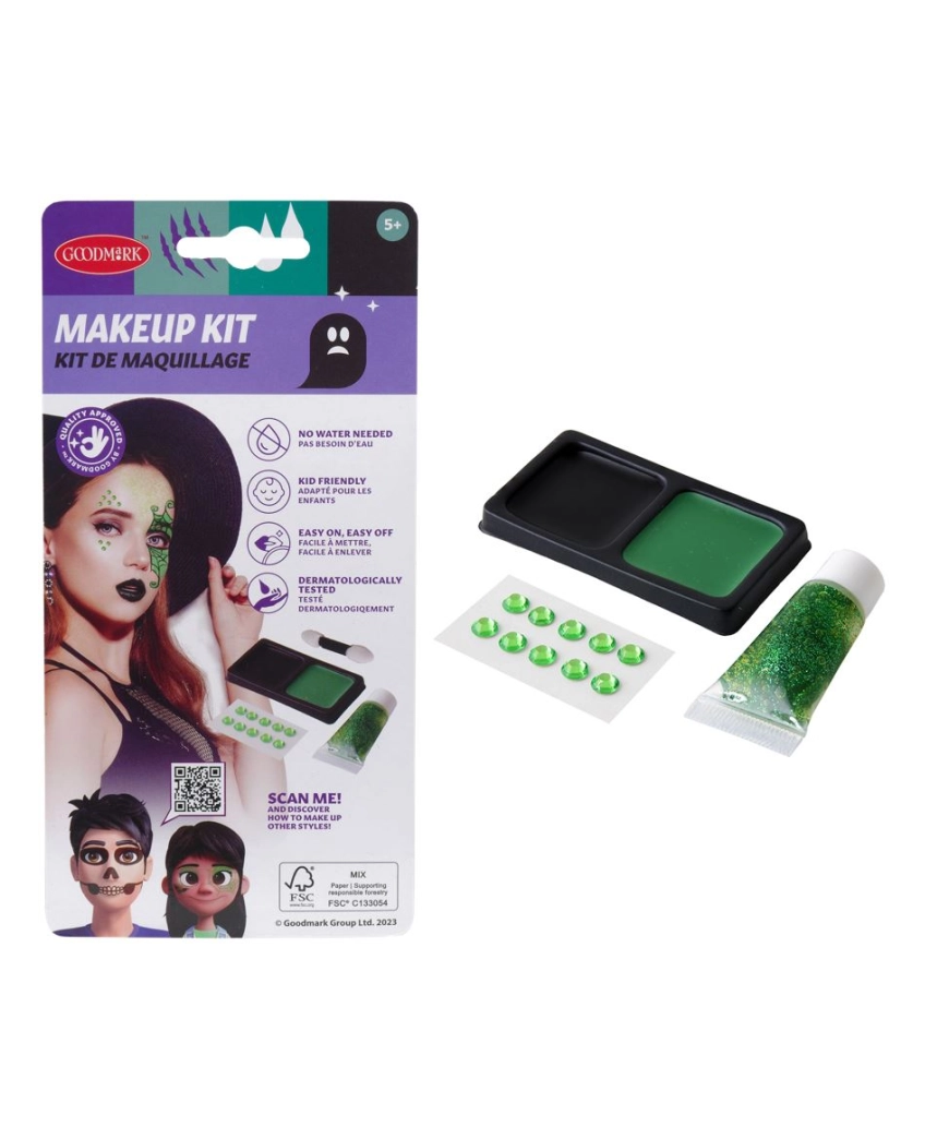 Kit complet pour un maquillage de sorcière élégant, avec strass adhésif. Application simple et effet garanti.